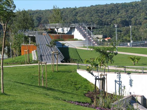 O miradouro é uma estrutura notável, construída no ponto mais elevado do terreno, junto ao Viaduto Duarte Pacheco. No seu topo, uma espiral metálica oferece uma vista panorâmica. Na base, encontram-se pilares e uma fonte estreita e semicircular, com jatos de água.