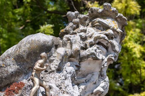 Alegoria ao Adamastor, figura criada por Camões em Os Lusíadas, símbolo do Cabo das Tormentas. Esculpida por Júlio Vaz Júnior em mármore azulino, expressa o poder do mar e a fragilidade humana, simbolizada pela pequena figura em bronze do escultor. Inaugurada em 1927 no Jardim do Alto de Santa Catarina, Lisboa.