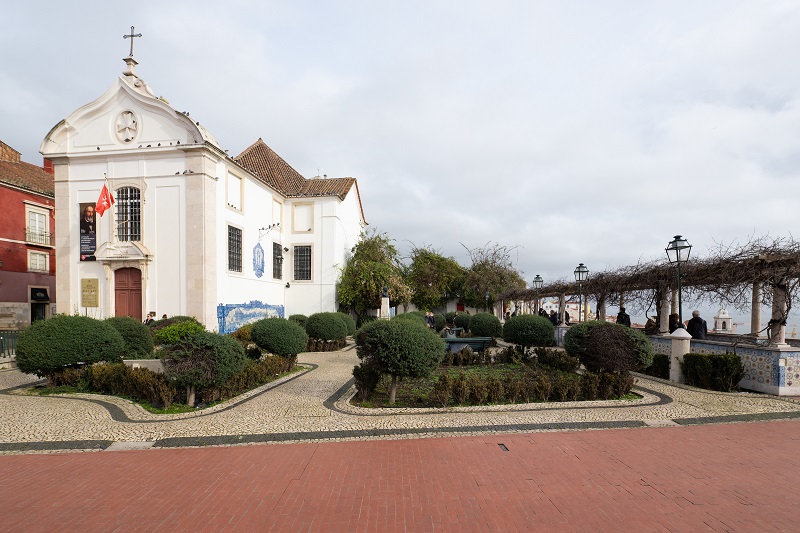 No espaço do jardim encontra-se a Igreja de Santa Luzia, construída no século XII sobre a antiga muralha que cercava Lisboa, com ligações históricas à Ordem de Malta. A fachada e muros do miradouro estão ricamente decorados com azulejos históricos, muitos deles produzidos pela Fábrica da Viúva Lamego. Entre os painéis destacam-se representações do cerco ao Castelo de São Jorge, no contexto da Reconquista Cristã, e da antiga Praça do Comércio antes do terramoto de 1755.