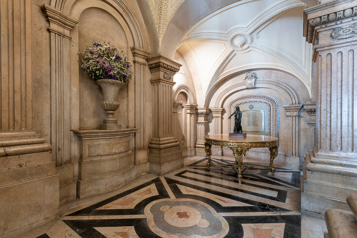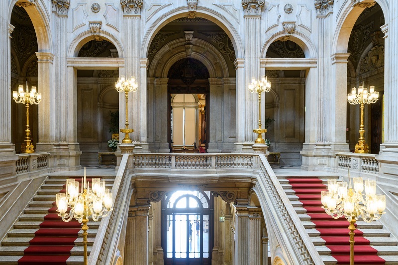 - Escadaria nobre em mármore, iluminada por cúpula de ferro e vidro, com pinturas de Pereira Cão e alegorias de Columbano Bordalo Pinheiro.